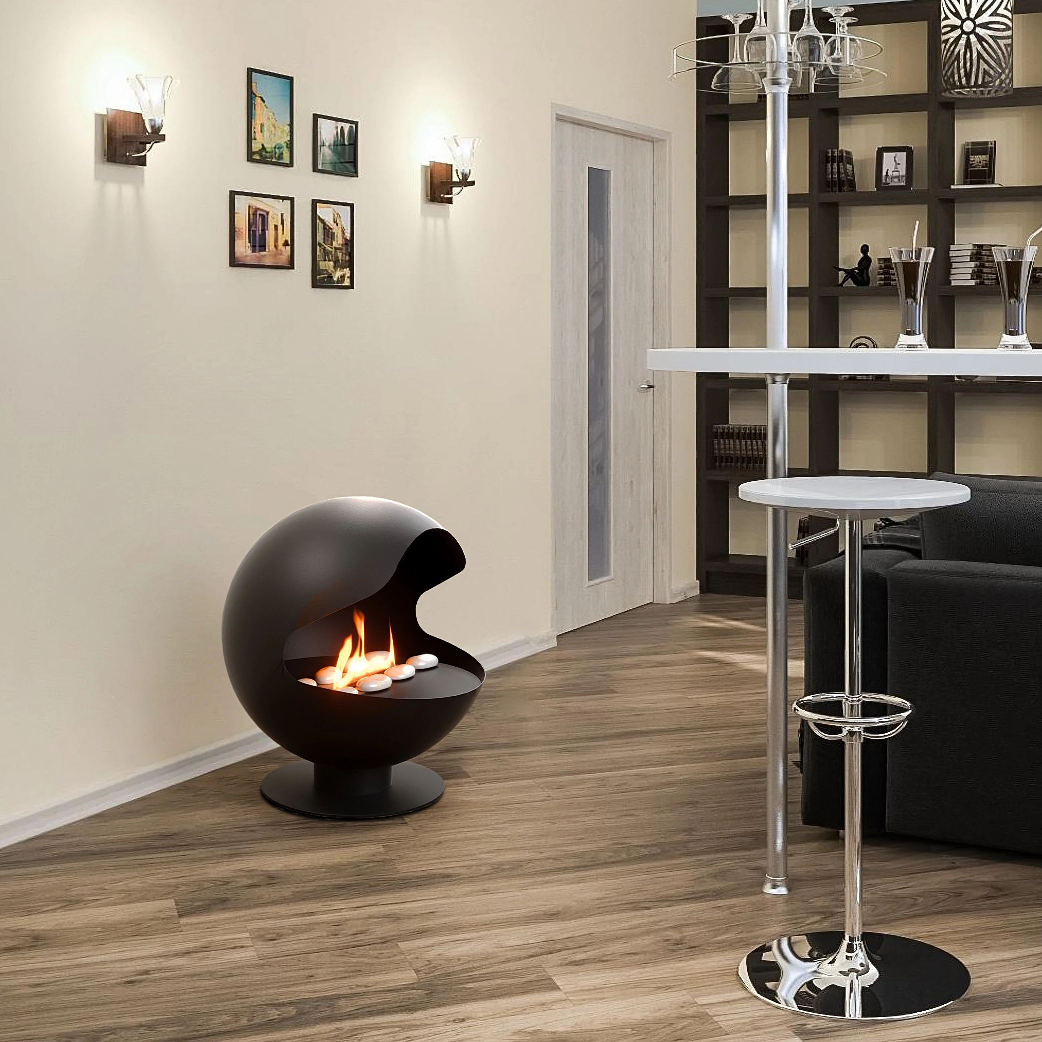 Напольный поворотный на 360 градусов биокамин исполнен в благородном черном цвете и имеет сферическую форму, устремленную к совершенству.
