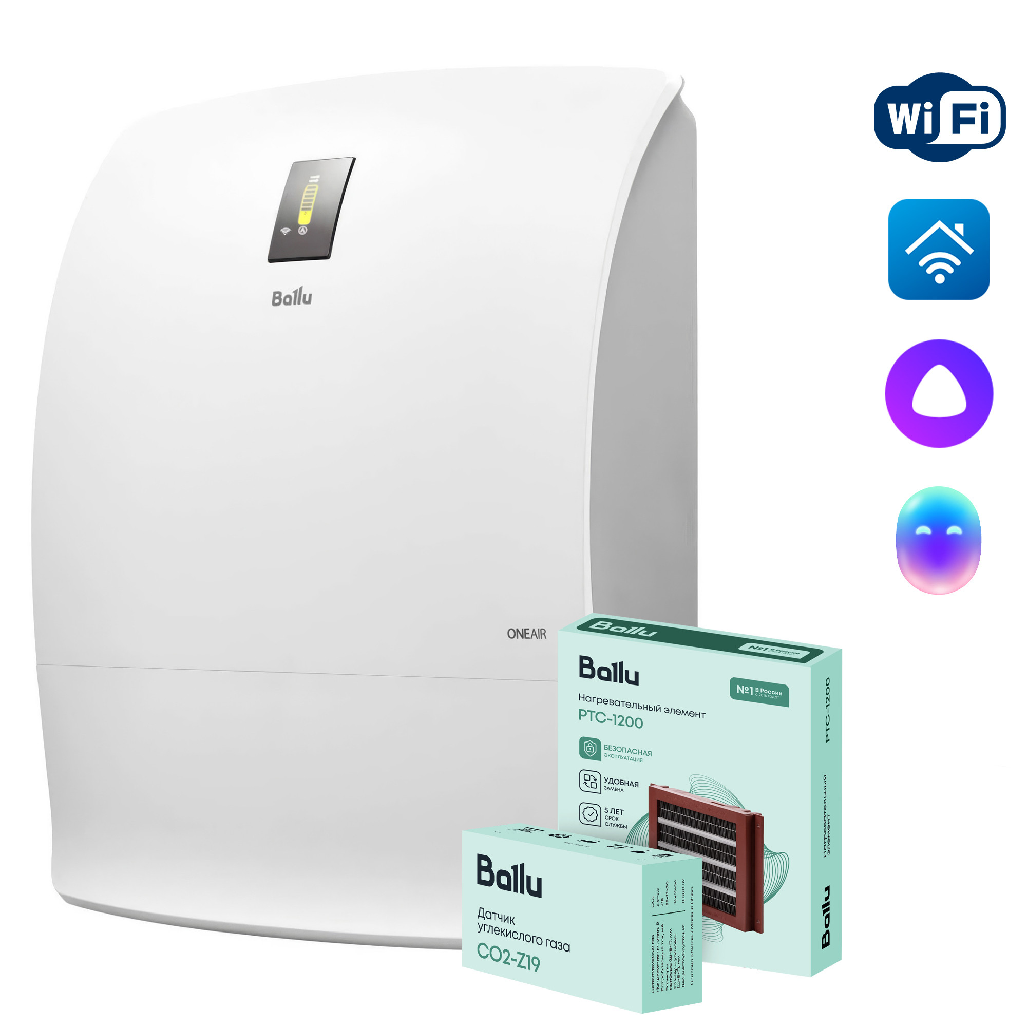 Ballu ONEAIR ASP-200SPMAX – инверторный приточный очиститель воздуха с интеллектом. Предназначен для подачи свежего и очищенного воздуха в любые жилые помещения площадью до 75 кв.м. В комплекте высокоэффективный керамический нагревательный элемент мощностью 1200 Вт, который подогревает входящий воздух. При этом прибор эффективно работает в осенне-зимний период при температуре наружного воздуха до -40°С. Профессиональная система очистки воздуха, состоящая из 6 ступеней, устраняет 99,9% загрязнений в воздухе, поглощает неприятные запахи, обеззараживает от вирусов и бактерий. В приборе есть арома-капсула для масел, позволяющая создать индивидуальную атмосферу на любой вкус. Встроенный датчик РМ2,5 в зависимости от качества воздуха автоматически управляет интенсивностью очистки в режиме циркуляции. Датчик CO2 (в комплекте) контролирует уровень углекислого газа в помещении и автоматически управляет клапаном притока, поддерживая оптимальный уровень CO2. Прибор имеет удобный интерфейс, который обеспечивают цветной дисплей и полифонический звуковой сигнал, встроенный Wi-Fi модуль для удаленного управления прибора с мобильных устройств, пульт ДУ в комплекте.