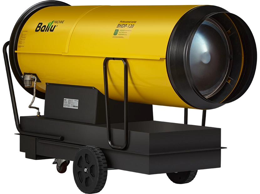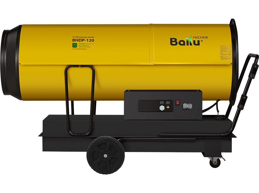 Воздухонагреватель дизельный прямого нагрева Ballu BHDP-120 серии Tundra предназначен для обогрева нежилых помещений и локального прогрева рабочих поверхностей. Тепловая мощность прибора составляет 120кВт. При работе дизельной пушки воздушный поток, проходя через защитную решётку – втягивается в камеру сгорания. Там он смешивается с распылённым форсункой дизельным топливом, которое при помощи мощного насоса под высоким давлением подаётся из топливного бака, образуя воздушно – топливную смесь. При помощи 12kV электродов смесь поджигается и сгорает, а затем - выбрасывается наружу, смешиваясь с продуктами сгорания и с основной массой поступаемого воздуха, тем самым нагревая его. Теплоотражающий экран, расположенный в передней торцевой части корпуса прибора- служит препятствием для вырывающегося открытого пламени и обеспечивает равномерный прогрев помещения либо обогреваемой рабочей поверхности.